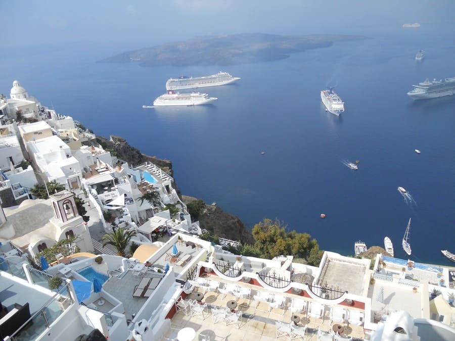 Muitas vezes, não é um único navio, mas coincide de parar três ou mais, como aconteceu no dia em que eu visitei Santorini na Grécia. Caos total!!!