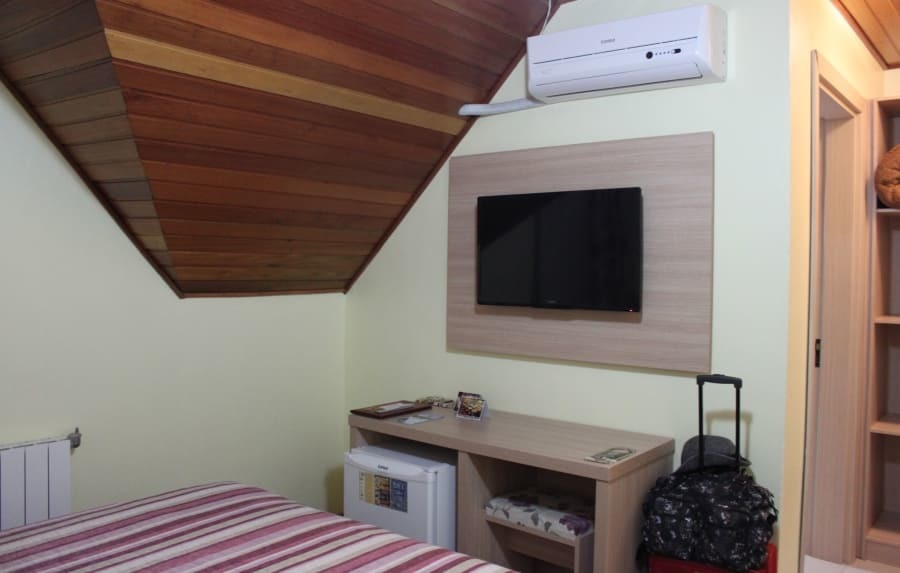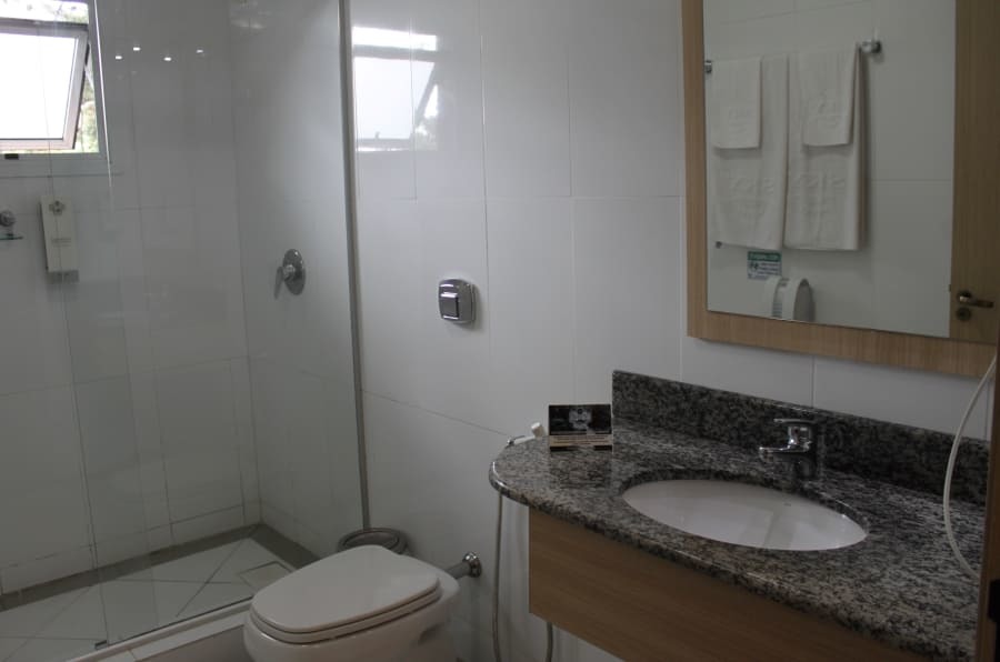 Também nesse quesito, o hotel se mostrou uma ótima opção. Minha acomodação contava com todos os itens de conforto: ar-condicionado split, ventilador de teto, televisão de tela plana, mesa de trabalho e frigobar.