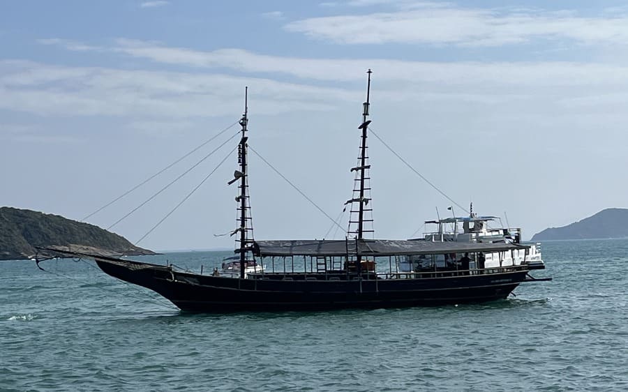 O navio fica parado próximo à Praia da Armação, mas o desembarque é feito através de tenders – que são aqueles barcos motorizados que levam os passageiros do navio até o porto.